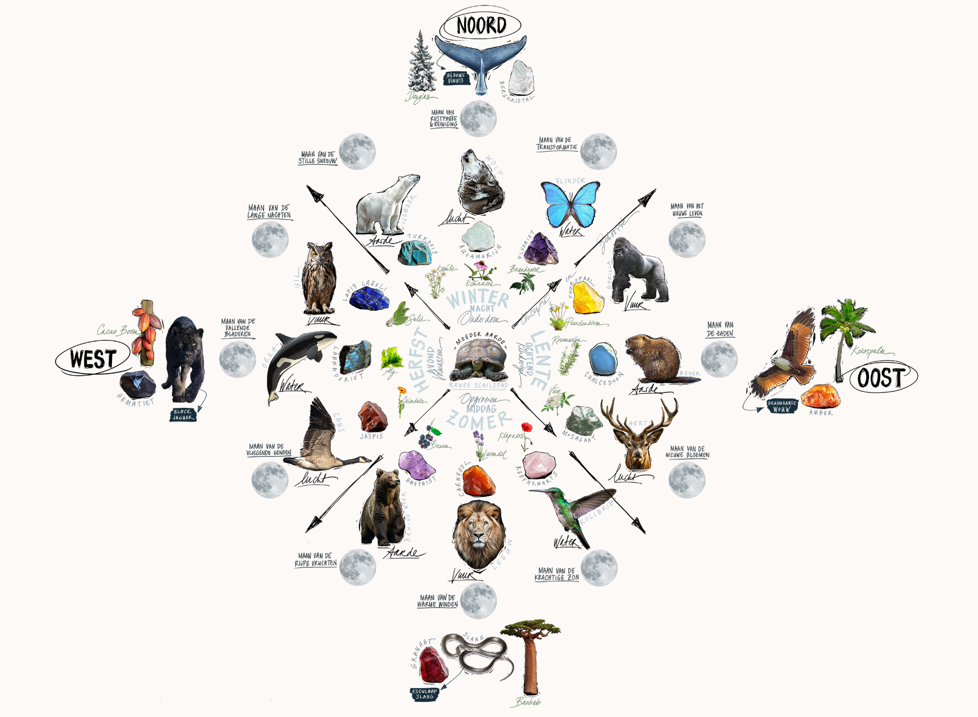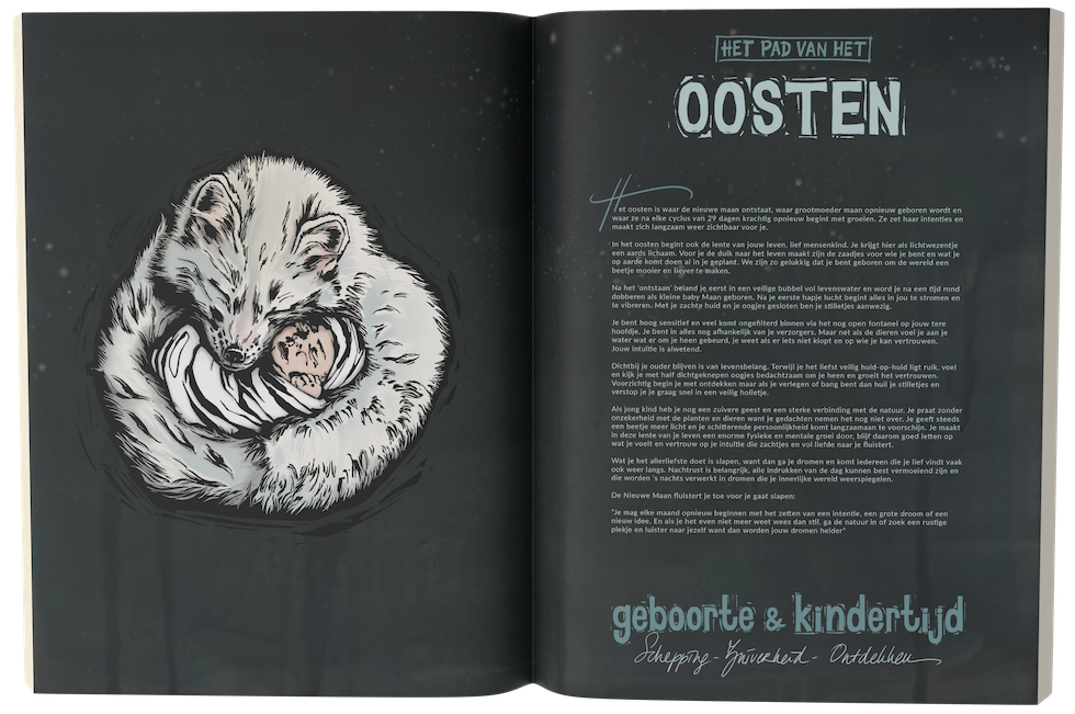 Laat je meeslepen met de vurige draak over de grote kale bergen van de zon, vlieg mee op de rug van pegasus over de stille maan-oceaan en beleef avonturen in de wilde bossen waar je wolven, beren en leeuwen ontmoet. Ieder dier heeft eigen verhaal, waar ze voor staan en welke kracht ze jou kunnen geven.