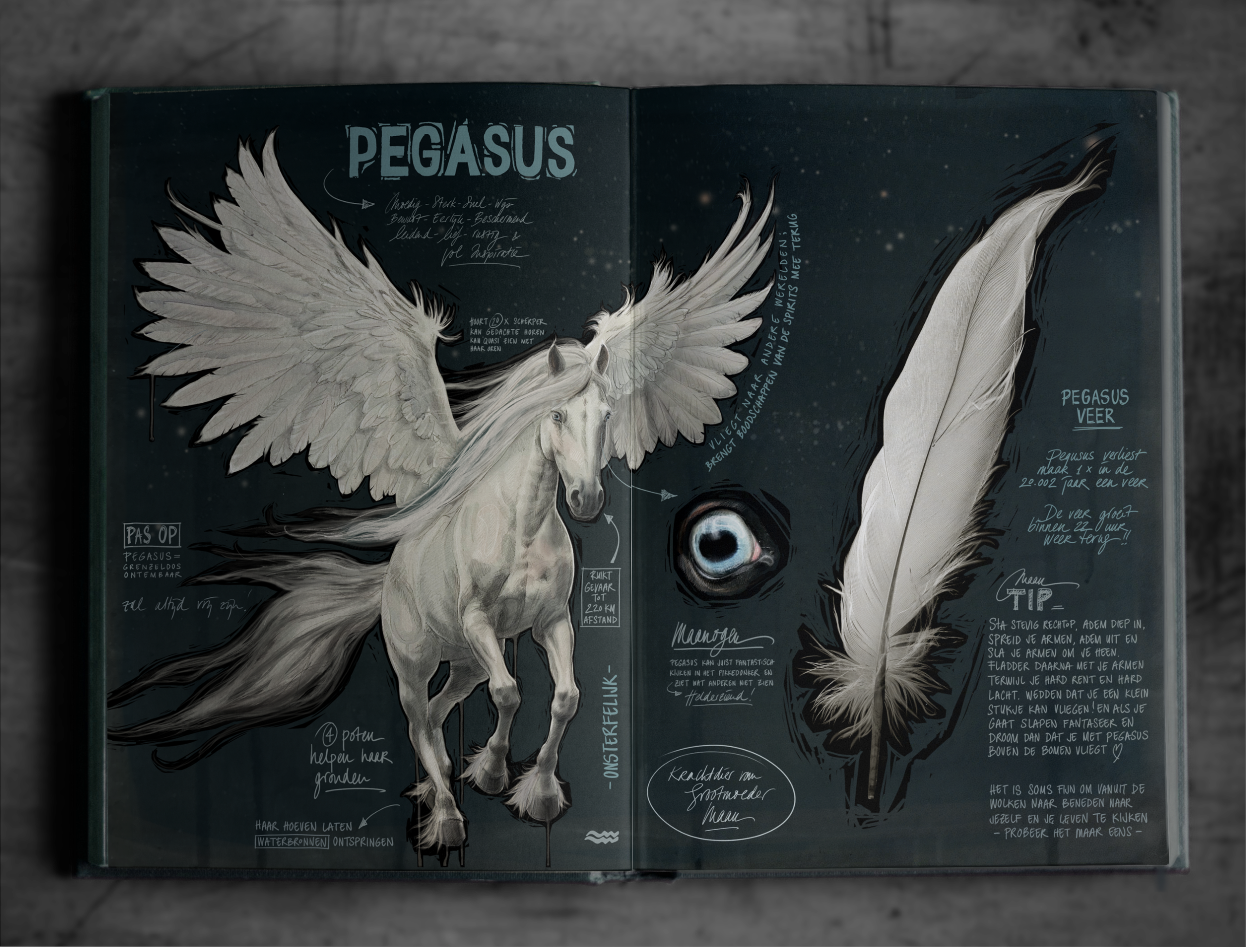 De prachtige illustraties in deze boeken zijn originele, met de hand gemaakte kunstwerken – sommige zo groot dat ze hele muren vullen. Elk werk is speciaal gecreëerd voor deze serie. Heb je een favoriet personage? Dan kun je er ook een original artwork of poster van krijgen. Hieronder een aantal pagina’s uit het hoofdboek.